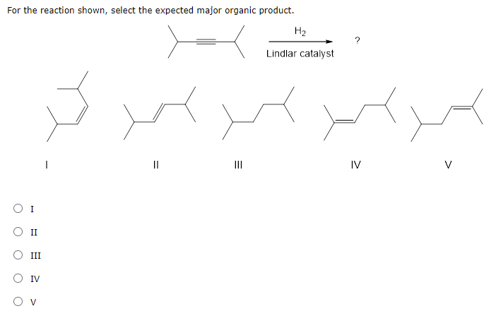 H2 Lindlars catalyst O II IV. B The two rings would be in perpendicular planes. H2 E- Lindlar catalyst 11 IV V ΟΙ II III O IV OV Which of the compounds shown below would be the most likely product expected from the reaction scheme shown.